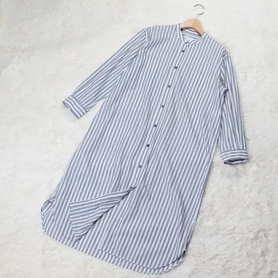 실크 혼방 SUNSPEL 셔츠 원피스 2 그레이 스트라이프 밴드 카라 긴팔 스탠드 카라 셔츠 원피스 루즈핏 고급 실크 絹 롱 롱 기장