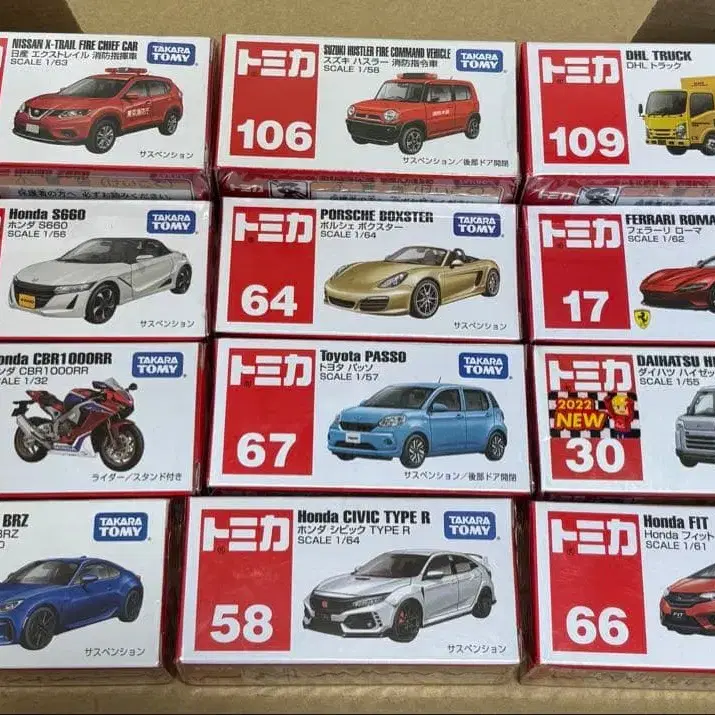 다양한 차종이 모인 토미카 컬렉션. - 모델명: Nissan X-Trail Fire Chief Car - 모델명: Daihatsu Hijet - 모델명: Honda Civic Type R - 모델명: Honda Fit - 모델명: Subaru BRZ - 모델명: Porsche Boxster - 모델명: Toyota Passo - 모델명: Honda S660 - 모델명: Honda CBR1000RR - 모델명: Ferrari Roma - 모델명: DHL Truck 방문해 주셔서 감사합니다. 시리즈 - 토미카 이전에 모았던 물건입니다. 모두 미개봉 상태로 상자에 넣어 보관했습니다. 카탈로그를 확인한 결과, 모두 단종된 것으로 생각됩니다. 배송비 문제로 세트로 발송되오니 양해 부탁드립니다.
