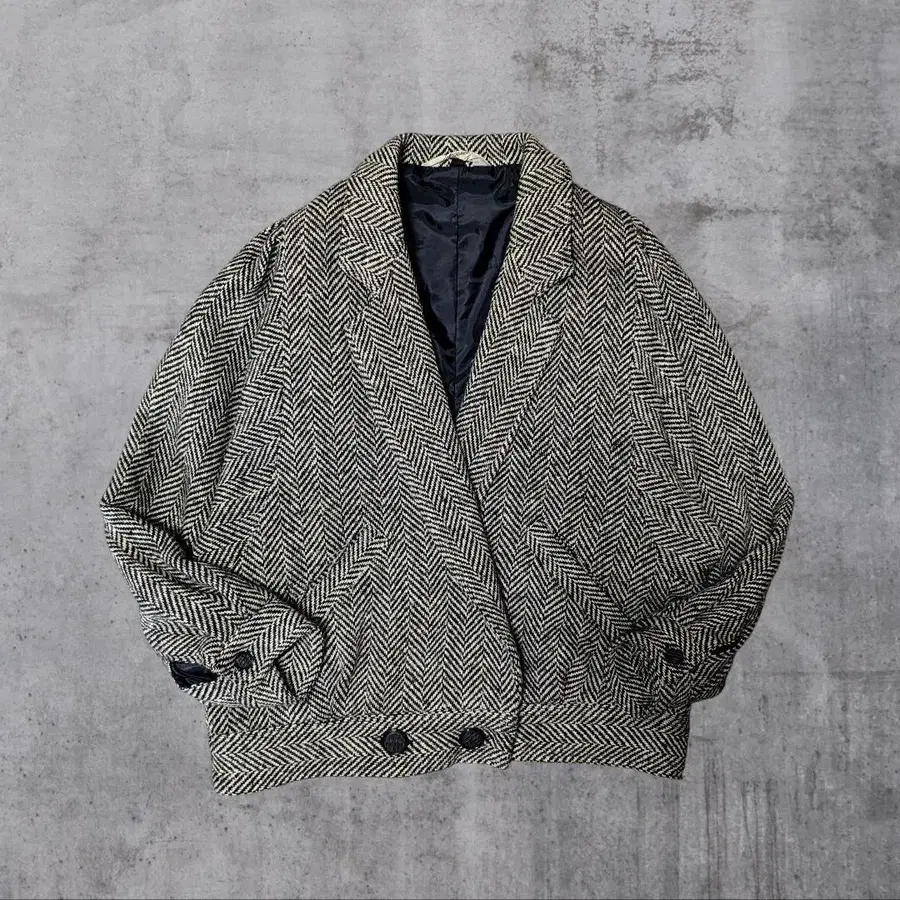 헤링본 트위드 자켓 숏 기장 울 레트로 버블 헤이세이 모드