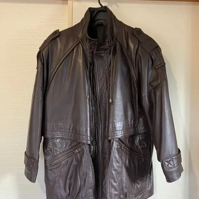 천연 가죽 소재의 브라운 레더 자켓입니다. 프론트 지퍼와 포켓이 있으며, 뒷면에 퀼팅 디자인이 적용되었습니다.