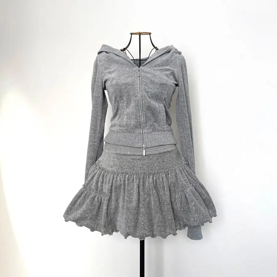 벨로아 맨투맨 소재 셋업, 프릴 스커트 포함. - 색상: 그레이 - 스타일: 후드 부착 셋업 - 소재: 맨투맨 소재 - 디자인: 프릴 스커트 - 후드: 있음 - 소매: 긴팔 색상 계열 - 그레이 계열 스커트 실루엣 - 플레어 얼룩, 찢김, 냄새 등 - 없음