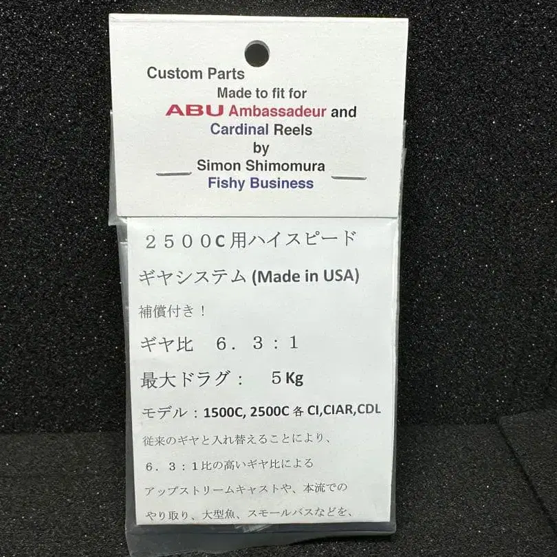 ABU 2500C용 사이먼 시모무라 씨의 하이 스피드 기어 시스템 기어비 6.3:1, 최대 드랙 5kg. - 모델: 2500C용 하이 스피드 기어 시스템 - 기어비: 6.3:1 - 최대 드랙: 5kg - 제조국: 미국 - 제조자: Fishy Business 잘 부탁드립니다.