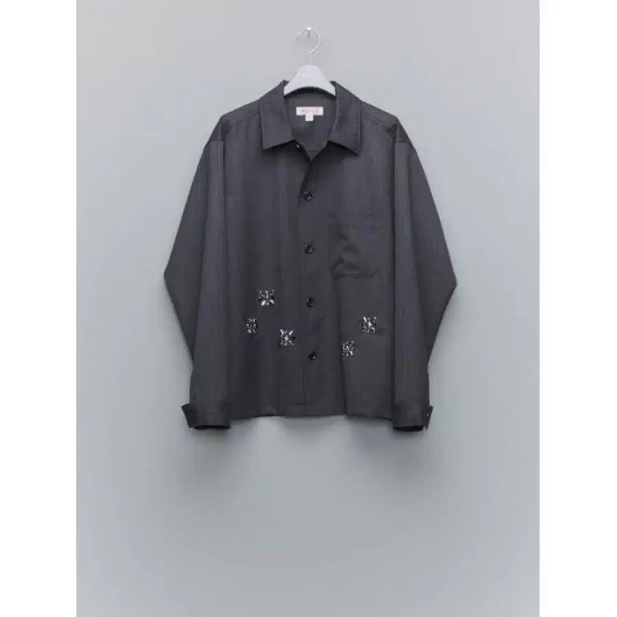 수트 원단의 오픈 카라 셔츠. 클래식한 인상의 수트 원단은 울 100% 트로피컬을 사용했습니다. 릴랙스한 밸런스의 실루엣은 셔츠이면서도, 아우터의 요소를 겸비한 올라운더 아이템입니다. 몸통 부분에 장식된 스터드는 꽃의 형태를 형상화하여 클래식한 원단에 악센트가 되고 있습니다. 사이즈 - L