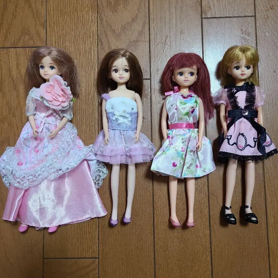 리카짱 인형 4체, 다양한 의상 포함. - 종류: 리카짱 인형 - 의상: 핑크 드레스, 보라색 드레스, 꽃무늬 드레스, 블랙 드레스 - 머리 색깔: 브라운 - 수량: 4체 세트 - 특징: 가동식 팔다리 - 사이즈: 약 23cm - 상태: 사용감 있음 방문해 주셔서 감사합니다.