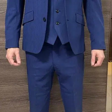자동 번역되었어요. 원문보기파란색 스트라이프 디자인의 쓰리피스 수트, 슬림핏 스타일.