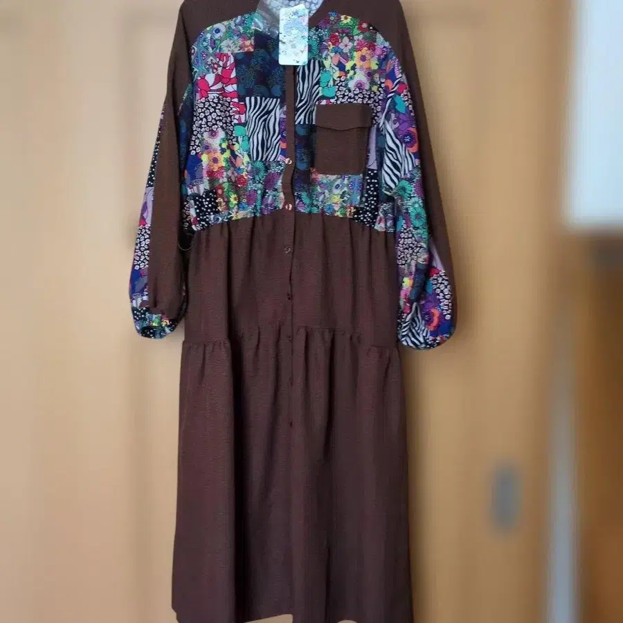 미사용 새상품 스칼라 올 패턴 와셔 티어드 셔츠 롱 원피스입니다. 앞과 뒤 상단, 양쪽 팔 부분에 패턴이 있습니다. 왼쪽 가슴 포켓. 허리 조절 가능. 앞 전체 버튼. 총길이 127. 잘 부탁드립니다.