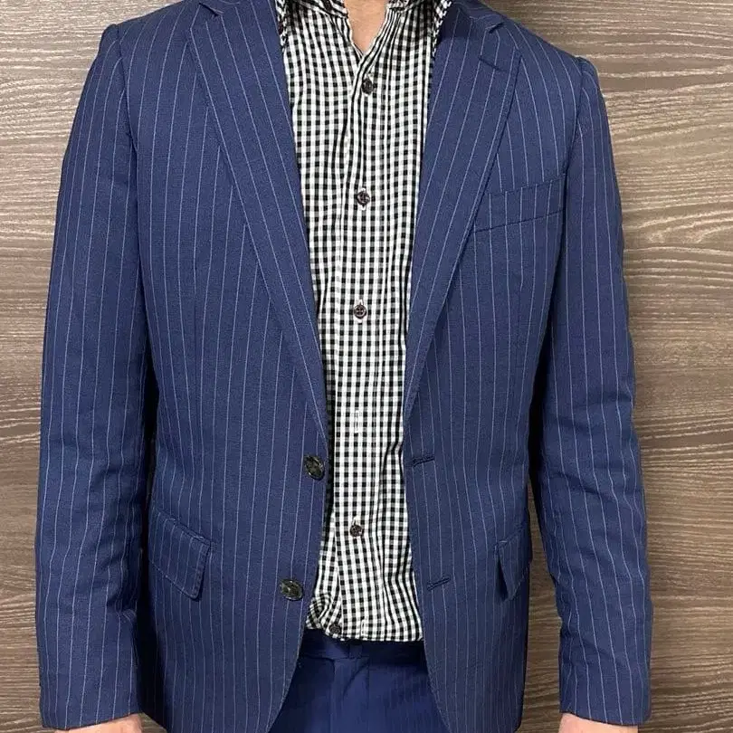 자동 번역되었어요. 원문보기네이비 스트라이프 비즈니스 정장, 슬림핏 디자인.