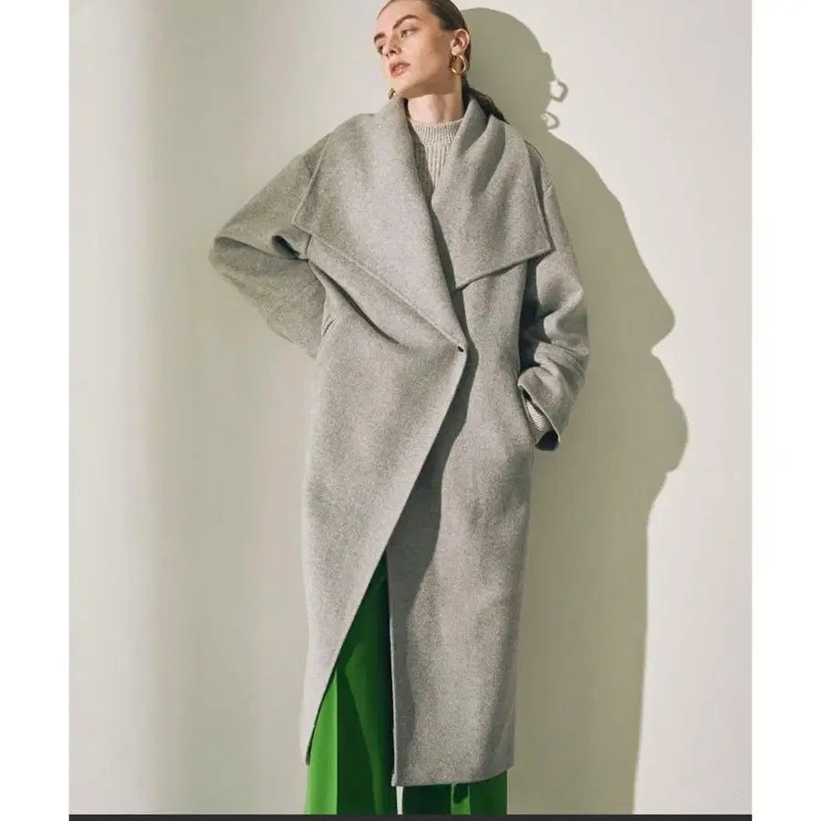 빅 사이즈의 옷깃이 특징인, 툭 걸치기 좋은 가운 타입의 롱 코트입니다.