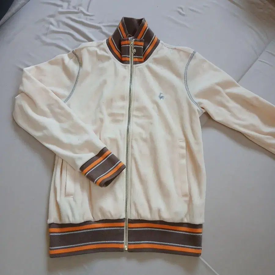 크림색 집업 저지, 스트라이프 리브 포함, M 사이즈, 폴리에스테르 100%. - 색상: 크림색 - 디자인: 스트라이프 리브 옷깃과 밑단 - 사이즈: M - 소재: 폴리에스테르 100% - 특징: 집업 스타일 방문해 주셔서 감사합니다.