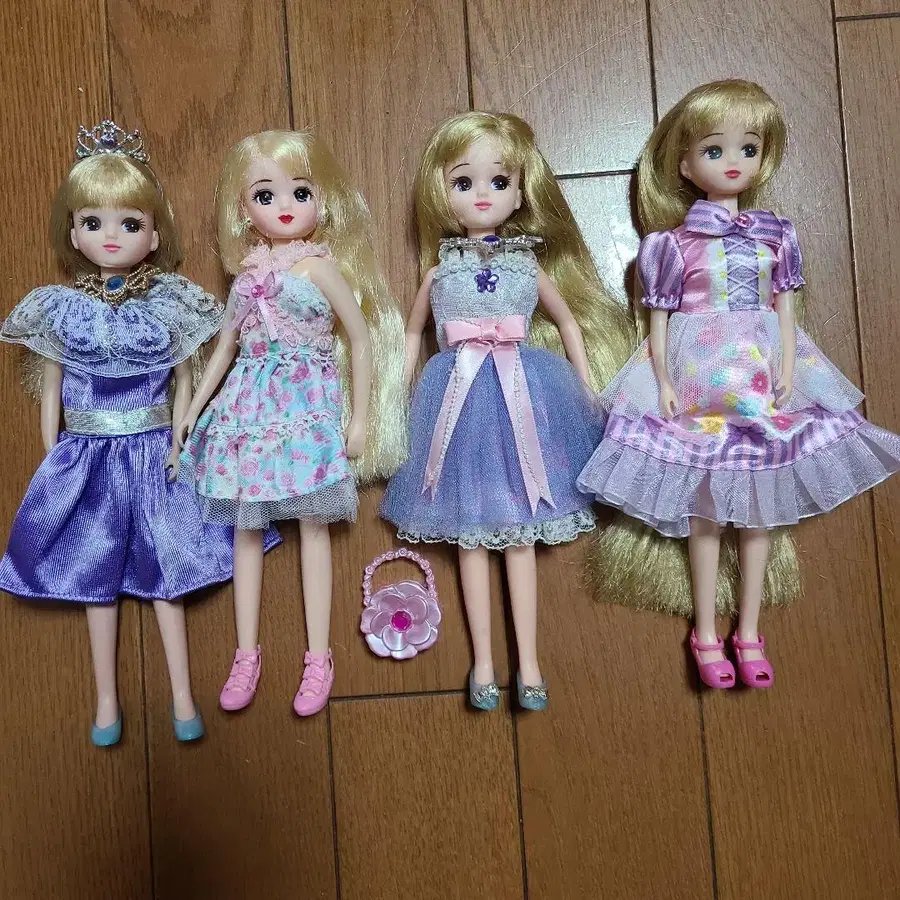 다양한 의상을 가진 패션 인형 4체 세트. - 인형 수: 4체 - 의상 색상: 보라색, 핑크, 파랑 - 액세서리: 백 포함 - 머리 색상: 금발 - 인형 스타일: 패션 인형 방문해 주셔서 감사합니다.