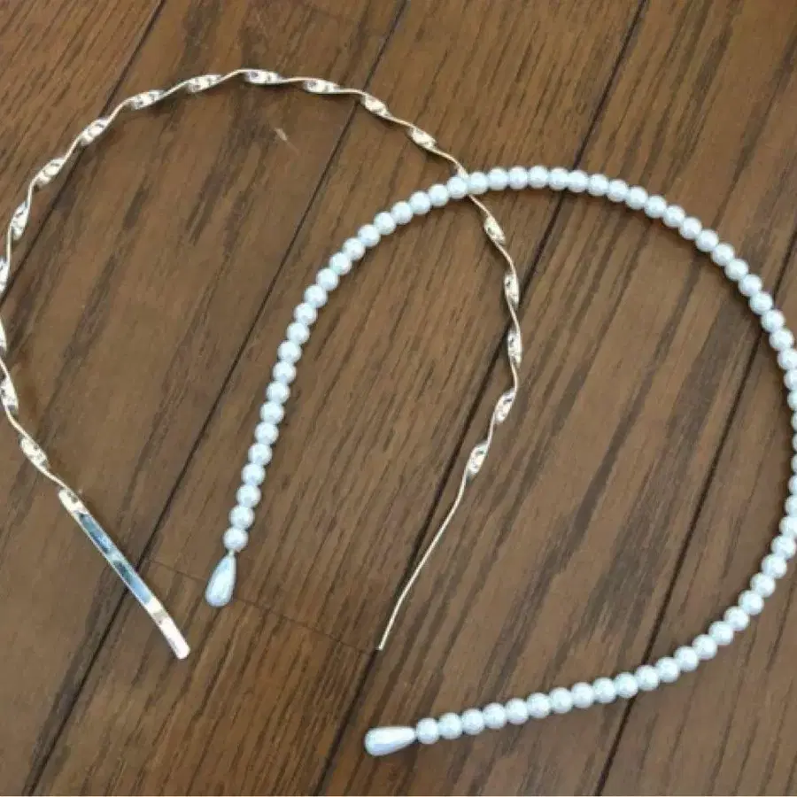 골드 컬러의 물결 머리띠와 펄 머리띠 2개 세트입니다. 작년 가을경 구매한 상품입니다. 미사용품입니다. 보관은 개인적인 관리이므로 양해 부탁드립니다.