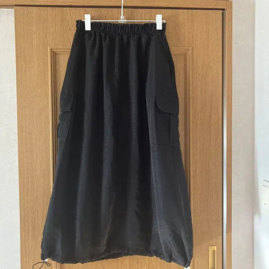 밑단에 드로우 스트링이 달린 심플한 블랙 롱 스커트. - 색상: 블랙 - 디자인: 심플 - 특징: 밑단에 드로우 스트링 포함 - 포켓: 있음 양 사이드 카고 포켓도 사용 가능 약간의 광택감이 있는 원단 사이즈 - M 스커트 길이: 약 86cm 허리밴딩 안감 없음