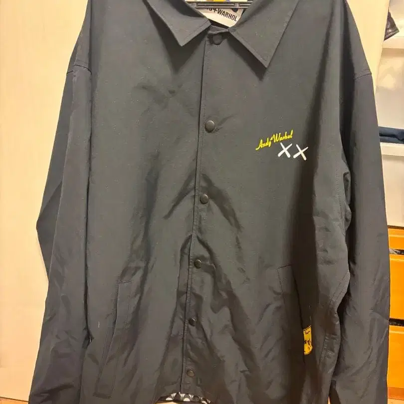 블랙 나일론 자켓, KAWS+WARMUP XL 사이즈, 뒷면에 그래픽 디자인과 앞면에 자수 로고 포함. - 브랜드: KAWS+WARMUP - 사이즈: XL - 색상: 블랙 - 디자인: 뒷면에 그래픽 디자인 있음 - 특징: 앞면에 자수 로고 있음 방문해 주셔서 감사합니다.