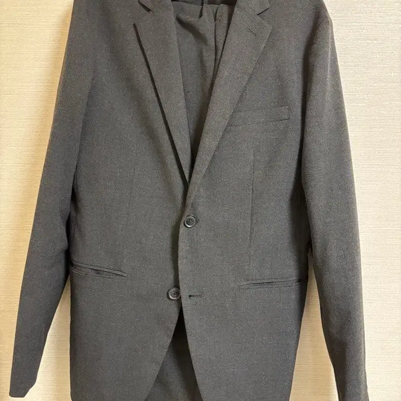 GlobalWork 셋업. 2016년경 구매하여 총 10회 정도 사용. 자켓 M 사이즈, 팬츠 S 사이즈. 그레이 색상의 심플한 자켓.