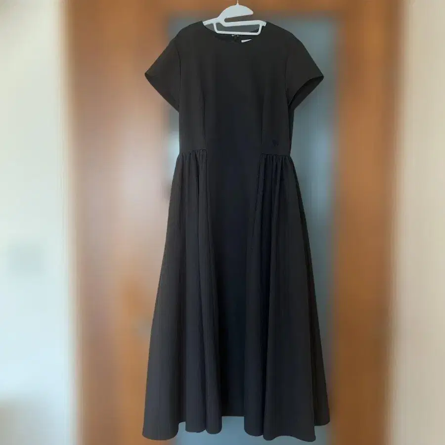 심플하고 엘레강트한 반팔 롱 원피스, 플레어 스커트와 자수 로고가 특징.