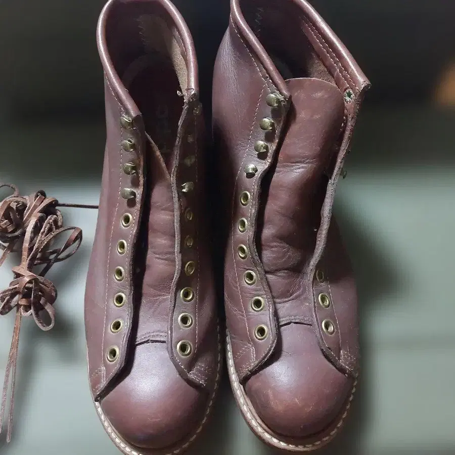 가죽 소재의 브라운 하이컷 워크 부츠, 금속제 아이렛 포함.