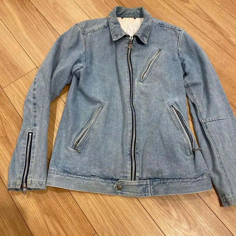 - 브랜드: monkey time - 색상: 옅은 데님 블루 - 사이즈: L - 디자인: 지퍼 포켓 부착 - 스타일: 데님 자켓 목 부분에 금장 장식은 없습니다. 금장 장식 색이 목 부분에 묻어 있지만, 착용하면 신경 쓰이지 않습니다.