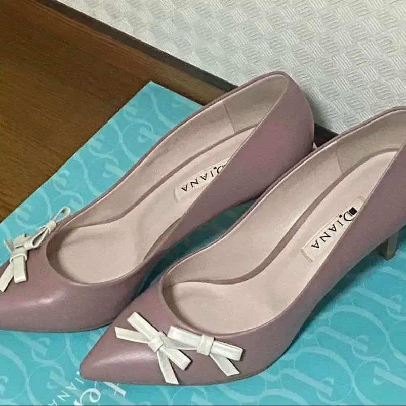 다이애나의 리본 포함 펌프스입니다. 더스티 핑크 색상에 리본이 달려 있어 매우 귀엽습니다. 프론트뿐만 아니라 백에도 작은 리본이 달려 있어 뒤에서 봐도 귀엽습니다. 미사용 새상품이지만 보관했던 제품이므로 신경 쓰이지 않는 분 부탁드립니다 ♡
