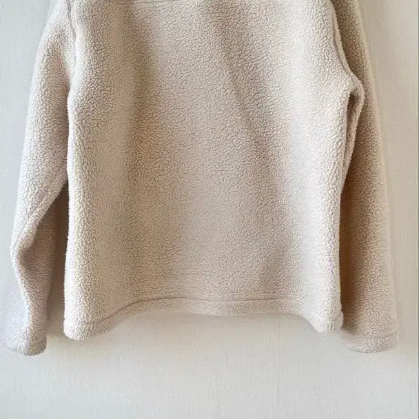 부드러운 플리스 소재의 베이지 자켓, 카라 부착으로 따뜻함을 제공합니다. 왼쪽 소매에 보풀, 올풀림 있음. - 색상: 아이보리 - 소재: 플리스 - 디자인: 긴팔, 지퍼 없음, 카라 부착 방문해 주셔서 감사합니다.