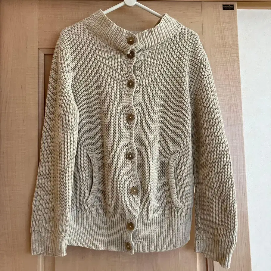 크림색 니트 가디건, 버튼이 있고 포켓이 있습니다. - 색상: 크림색 - 디자인: 버튼 부착 가디건 - 브랜드명: Howard - 소재: 니트 - 특징: 포켓 부착 기장 약 57cm, 가슴 너비 약 45cm, 소매 길이 약 56cm 방문해 주셔서 감사합니다. 사이즈 - M