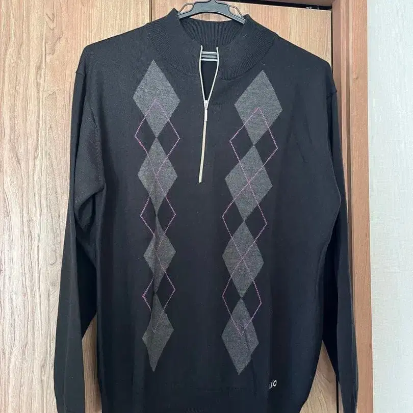 자동 번역되었어요. 원문보기지퍼가 달린 블랙 스웨터, 다이아몬드 패턴이 특징입니다.