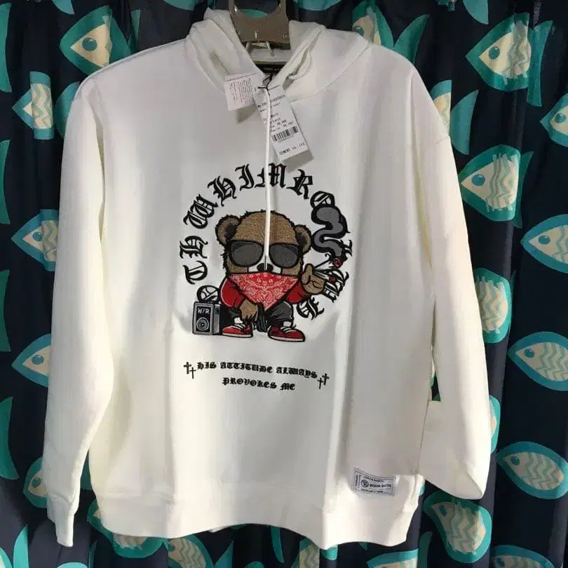 자수 테디베어 디자인이 특징인 화이트 후드티 ‼️