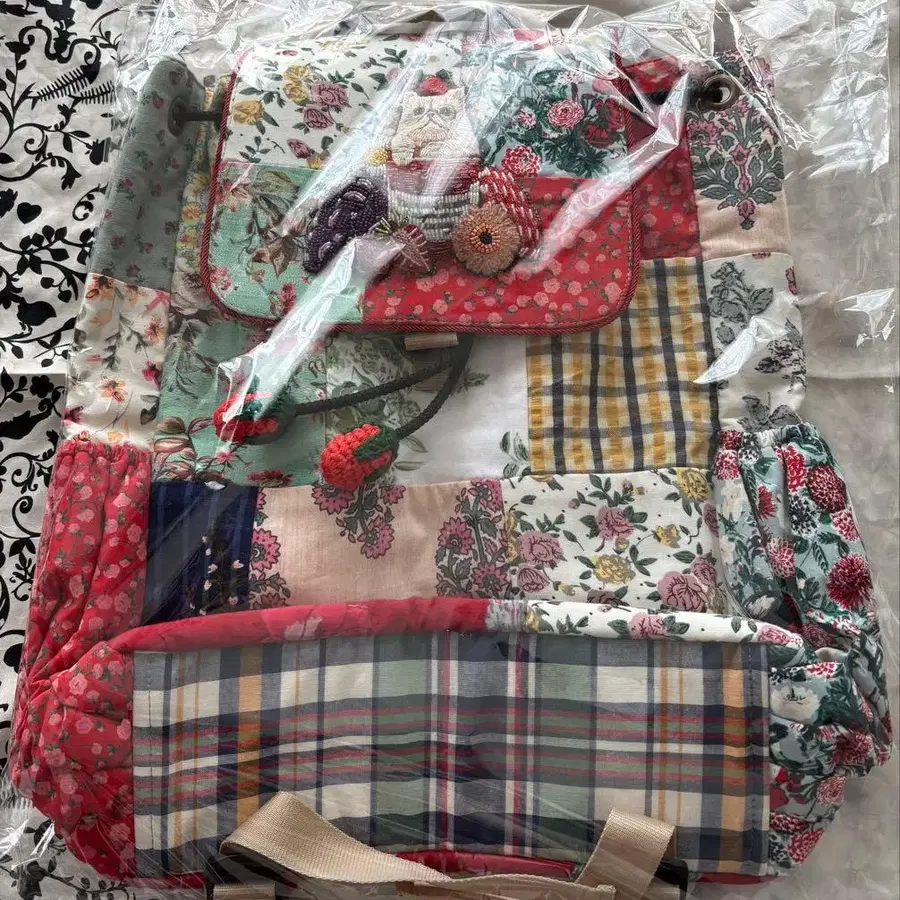 다양한 패턴의 패치워크에 고양이 자수와 후르츠 비즈 자수가 럭셔리하며 아주 귀여워요.