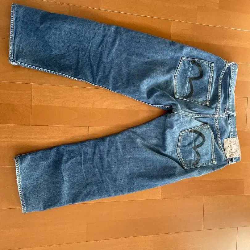 유니크한 백 포켓 디자인의 블루 데님 팬츠입니다. 무릎 부분은 포켓 타입의 독특한 상품입니다.