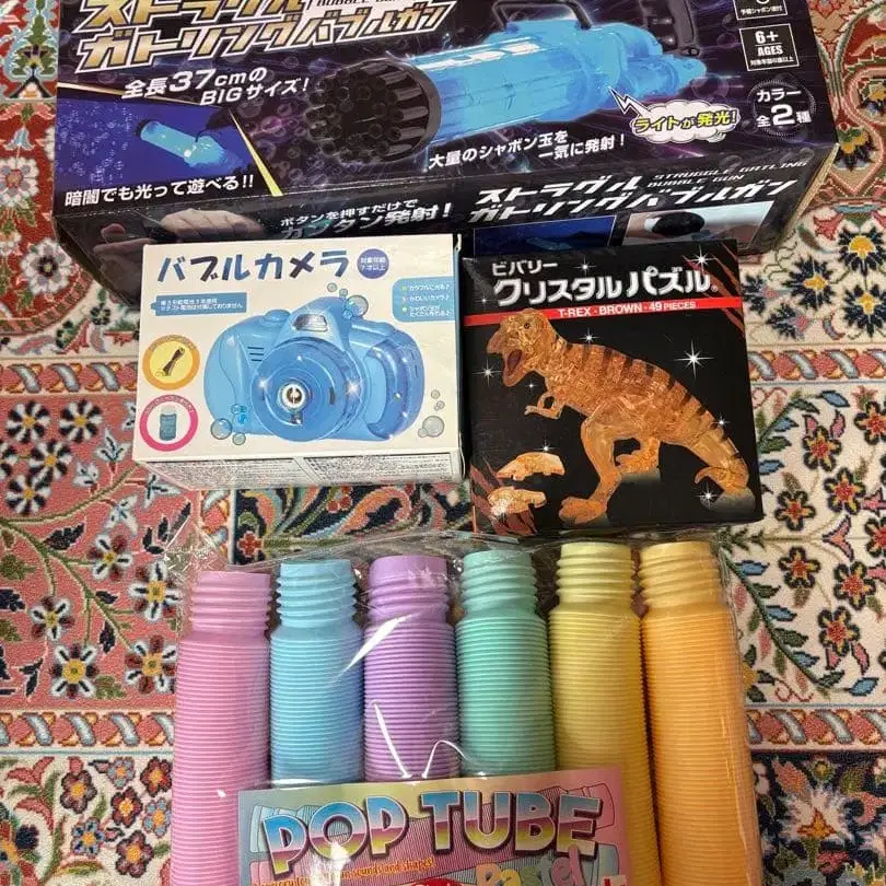방문해 주셔서 감사합니다. POP TUBE, 버블 카메라, 비버리 크리스탈 퍼즐, 스타라 그루 가트링 버블 건 4점 세트입니다. POP TUBE은 봉투가 찢어졌지만 사용하지 않았습니다. 4점 모두 미사용 새상품입니다. 잘 부탁드립니다.