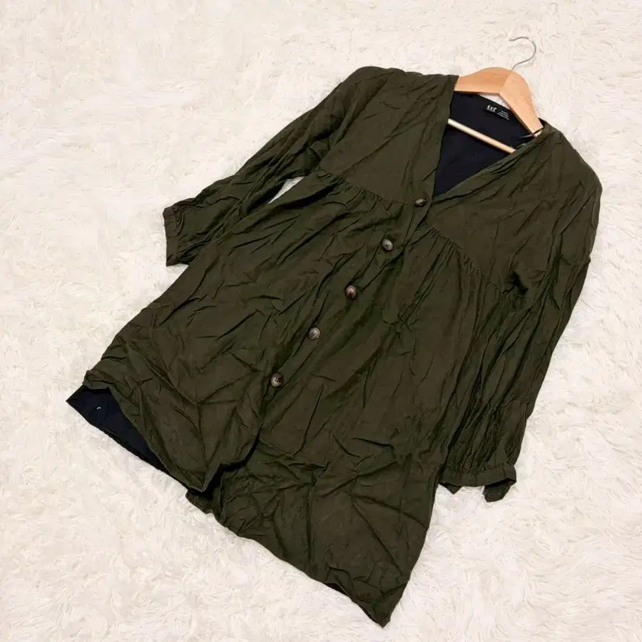 ◯ 특징: 프론트 버튼 / 개더 절개 디자인 / 주름 가공풍의 내추럴한 질감 / 7부 소매