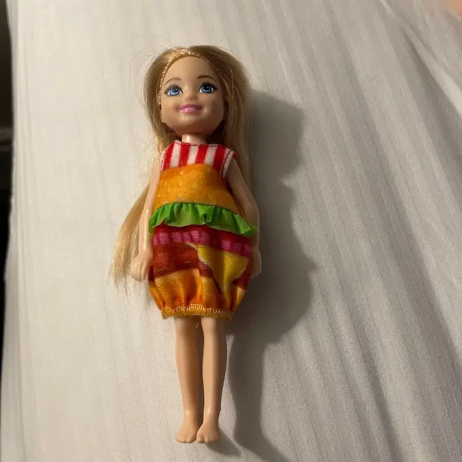 빈티지 USA 마텔 정품 바비 참 첼시 바비 클럽 첼시 드레스업 인형 (햄버거 코스튬) 입니다. 브랜드: 바비 대상 연령: 3세부터 7세 높이: 약 15.24 cm (6인치) 특징: 햄버거를 모티브로 한 드레스와 프릴 장식의 양상추 토핑이 특징입니다.
