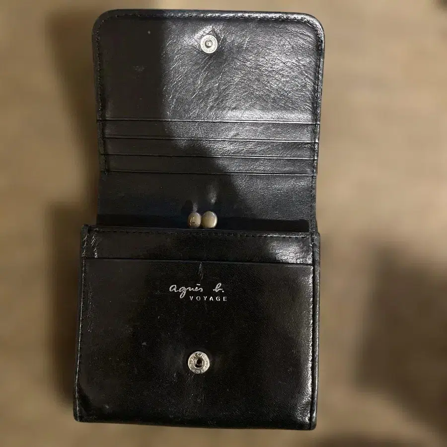 가죽 소재의 블랙 접이식 지갑, 카드 포켓이 있어 편리합니다. - 브랜드: agnis b - 스타일: 접이식 지갑 - 색상: 블랙 - 소재: 가죽 - 기능: 카드 포켓 있음 - 특징: 버튼 개폐식 방문해 주셔서 감사합니다.