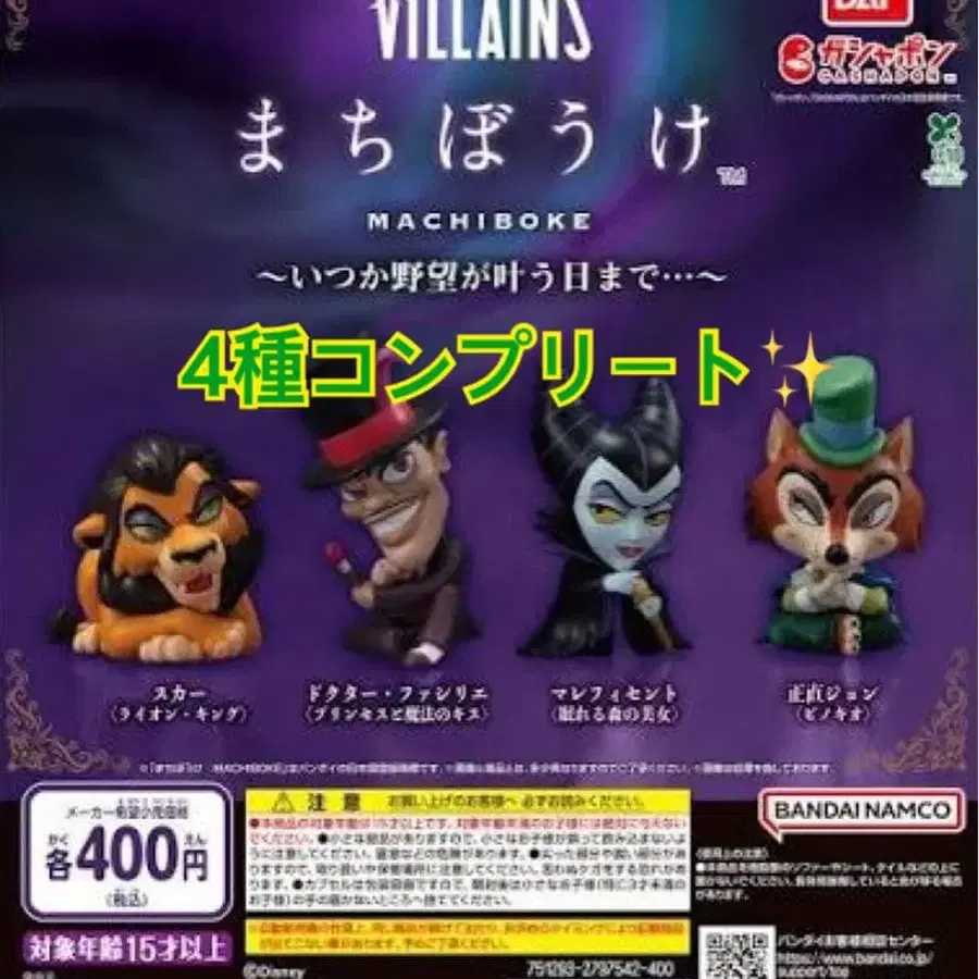 디즈니 VILLAINS 기다림 ~언젠가 야망이 이루어지는 날까지~ ★ 4종 컴플리트 ★ - 캐릭터: 스카 1체, 닥터 파실리에 1체, 말레피센트 1체, 허풍쟁이 조니〈피노키오〉 1체 - 수량: 4체 세트 - 브랜드: 반다이 - 상품 상태: 미개봉 새상품 ※ 네고 불가. 낱개 판매 불가. #BANDAI #반다이 #캡슐 토이 #가챠가챠 #디즈니 #Disney #기다림 #빌런즈