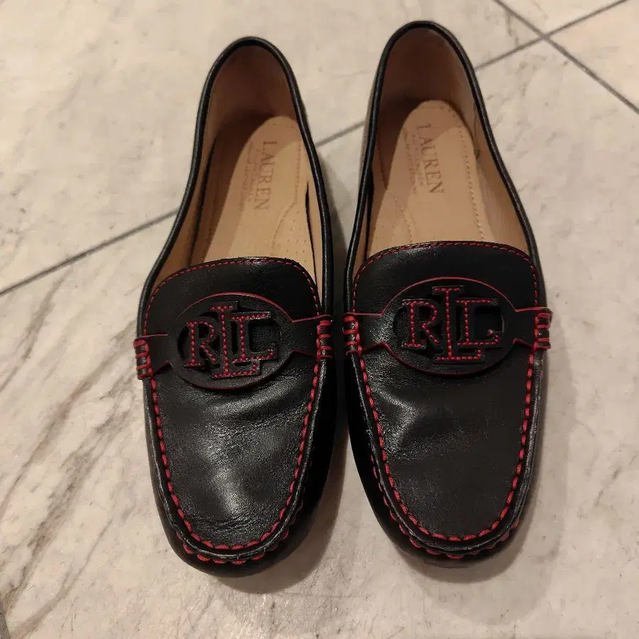 가죽 소재의 블랙과 레드 로퍼, 러버 솔이 있어 착용감이 쾌적합니다.
