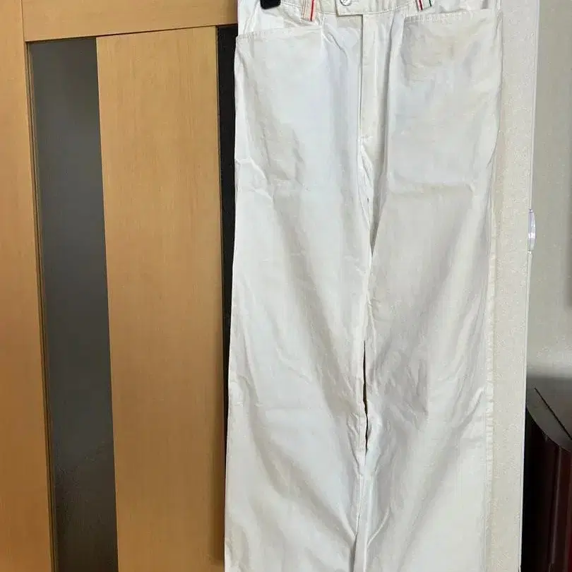 화이트 스트레이트 레그 치노 팬츠, 트리콜로르 스트라이프 포함.