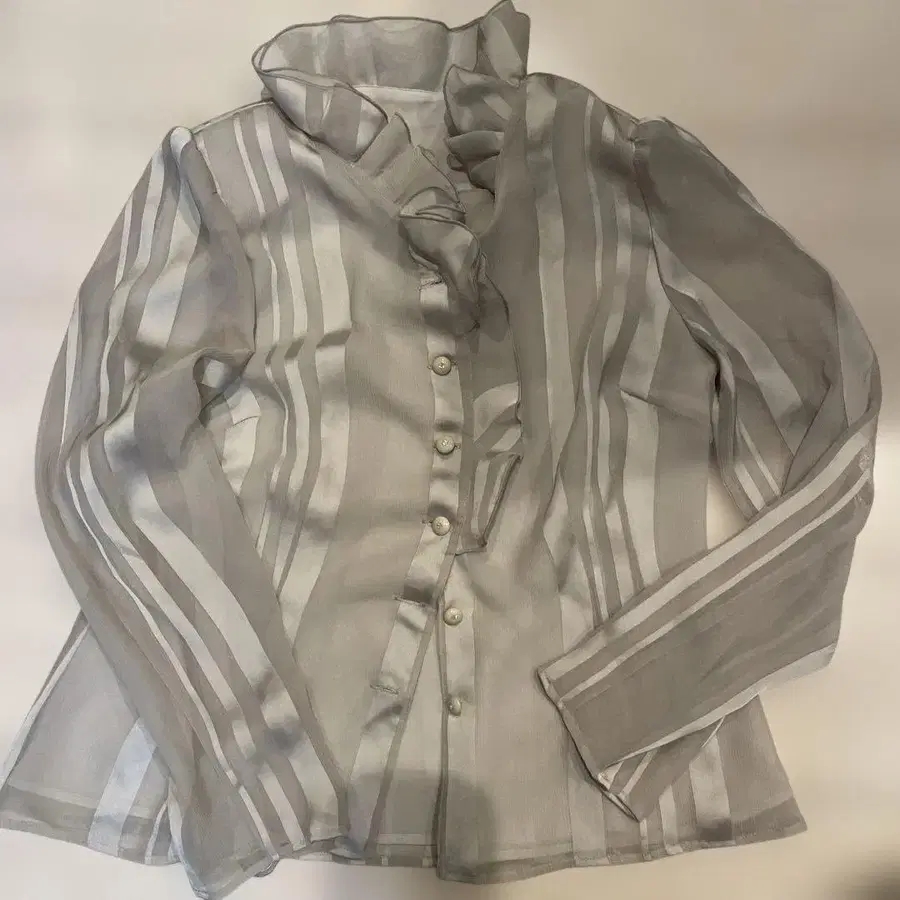 프릴이 달린 그레이와 화이트 스트라이프 셔츠, 폴리에스테르 100%로 가볍습니다. - 색상: 그레이와 화이트 스트라이프 - 소재: 폴리에스테르 100% - 사이즈: 9 - 디자인: 프릴이 달린 버튼 셔츠 방문해 주셔서 감사합니다.