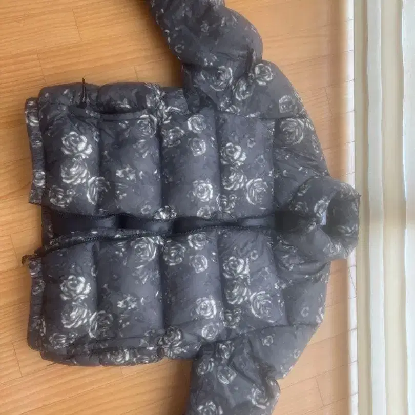 블랙 베이스에 화이트 장미 무늬가 있는 thisisneverthat PERtex 소재 다운 자켓.