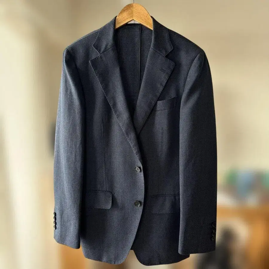 울 혼방 다크 블루 싱글 브레스 비즈니스 자켓, 내부 포켓 부착. ※ 약간 데님 같은 원단입니다. - 색상: 다크 블루 - 포켓: 내부 포켓 있음 - 버튼: 4개 버튼 - 디자인: 싱글 브레스 - 소재: 울 혼방 방문해 주셔서 감사합니다. 사이즈 - M