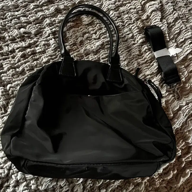 나일론 소재의 블랙 토트백으로, 탈부착 가능한 숄더 스트랩이 있어 수납력이 뛰어납니다.