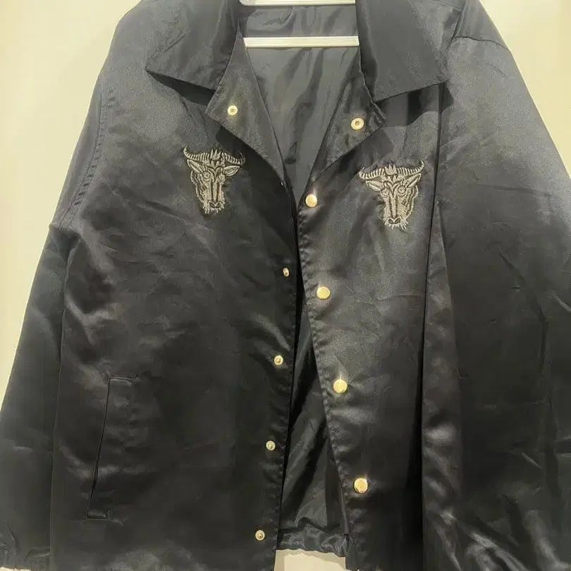 소의 자수가 특징인 블랙 나일론 자켓. - 색상: 블랙 - 디자인: 소 자수가 놓인 디자인 - 버튼: 골드 컬러 스냅 버튼 - 소재: 나일론 - 자수: 소 얼굴 자수가 2개 있음 - 자수 상세: 섬세한 자수 디자인 멋진 King Gnu의 나일론 자켓입니다. 자수가 귀엽습니다. 사이즈는 L 사이즈입니다. 방문해 주셔서 감사합니다. #KingGnu#킹누#누