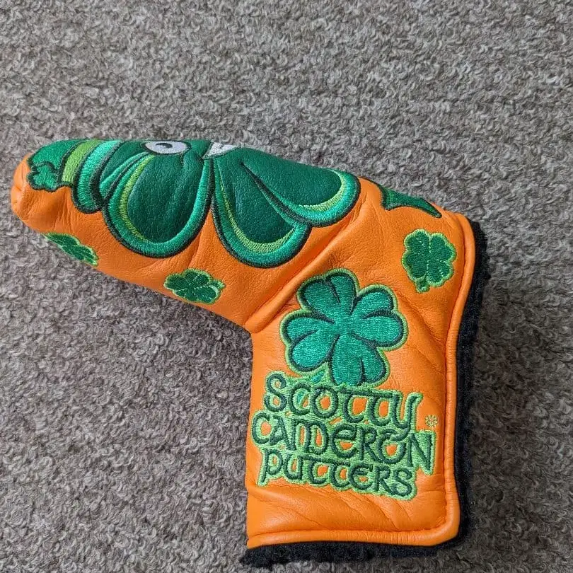 성 패트릭 데이를 테마로 한, 오렌지와 그린 클로버 패턴의 퍼터용 골프헤드커버. - 브랜드: Scotty Cameron - 디자인: 오렌지와 그린 클로버 패턴 - 이벤트: 성 패트릭 데이 2022 캐머런 정품