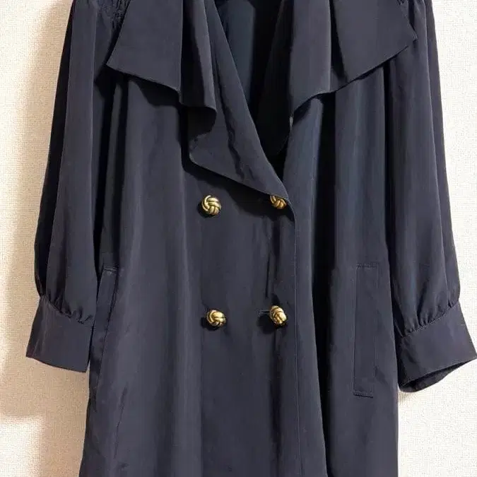 레리안의 트렌치코트 같은 얇은 소재의 겉옷입니다. 유행하는 골드 버튼에 케이프 같은 디자인. 원피스로도 사용하실 수 있을 것 같습니다. 사이즈 9 (M 상당) 기장 86, 가슴 너비 58, 소매 길이 64 눈에 띄는 흠집/얼룩 없음