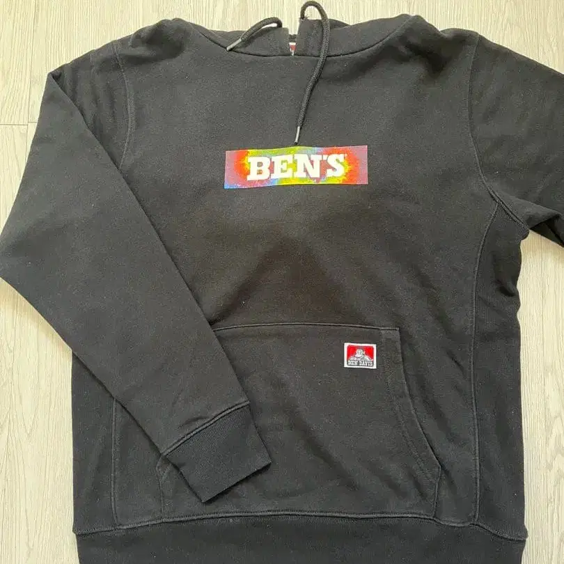 프론트에 컬러풀한 [BEN'S] 로고가 새겨진 블랙 후드티. - 색상: 블랙 - 디자인: 프론트에 컬러풀한 [BEN'S] 로고 - 포켓: 프론트 포켓 부착 - 스타일: 후드 부착 후드티 - 브랜드: BEN DAVIS 어깨 너비/가슴 너비/소매 길이/기장 어깨 너비 - 45cm 가슴 너비 - 50cm 소매 길이 - 63cm 기장 - 60cm 색상 - 블랙 계열 패턴 디자인 - 무지/원 포인트 얼룩, 찢김, 냄새 등 - 없음