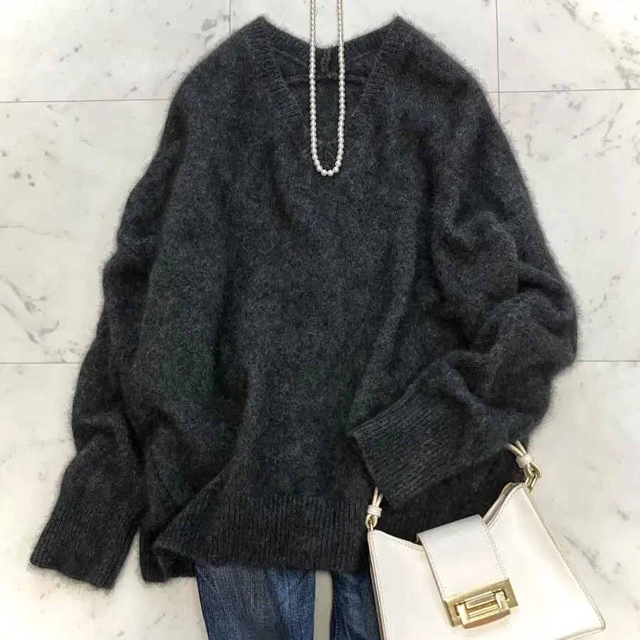 가볍고 따뜻한 라쿤 100% 소재를 사용한 V넥 니트 풀오버입니다.