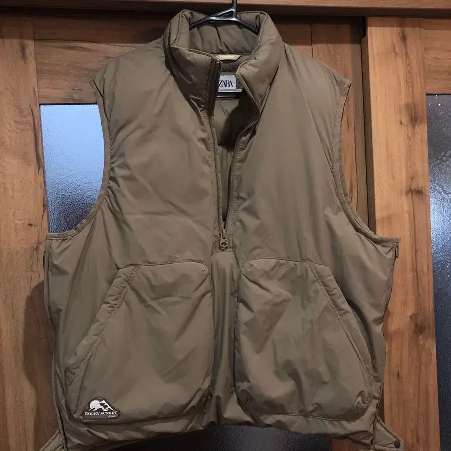 베이지 색상의 ZARA 제조 XL 사이즈 다운 베스트, 집업 디자인에 포켓이 있습니다.