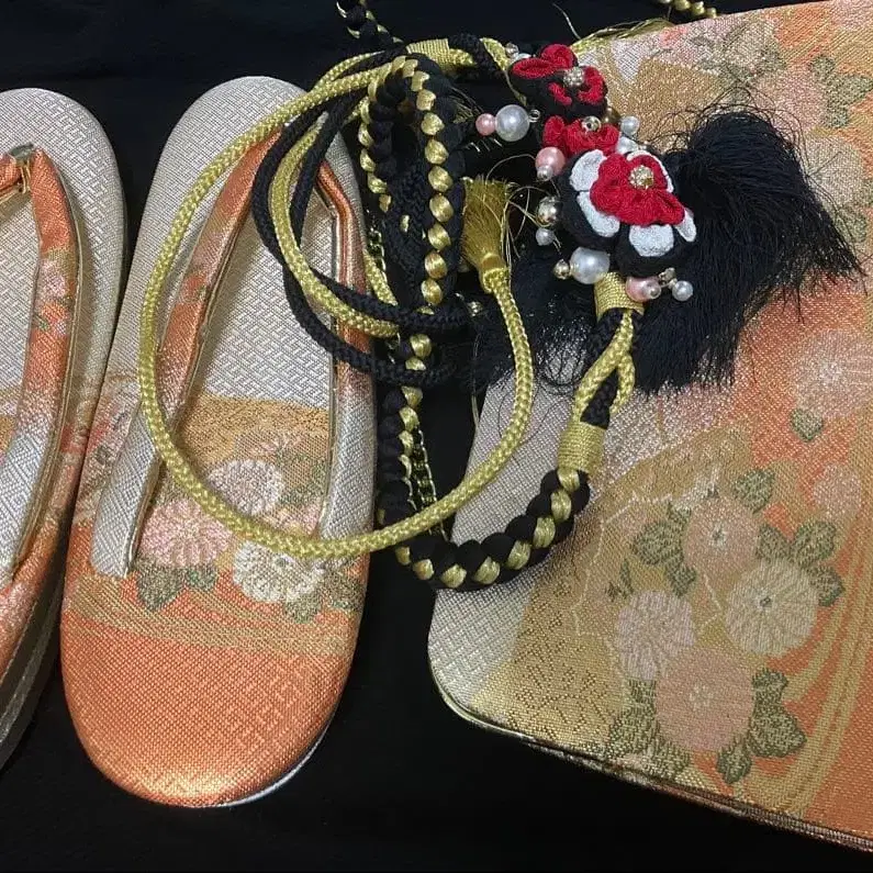 오렌지와 골드의 꽃무늬가 아름다운 조리와 백 세트. - 색상: 오렌지와 골드의 꽃무늬 - 소재: 합성섬유 - 타입: 조리와 백 세트 - 장식: 꽃 자수와 술 장식 - 디자인: 일본풍 디자인의 조리 - 사이즈: 조리 24cm 방문해 주셔서 감사합니다.