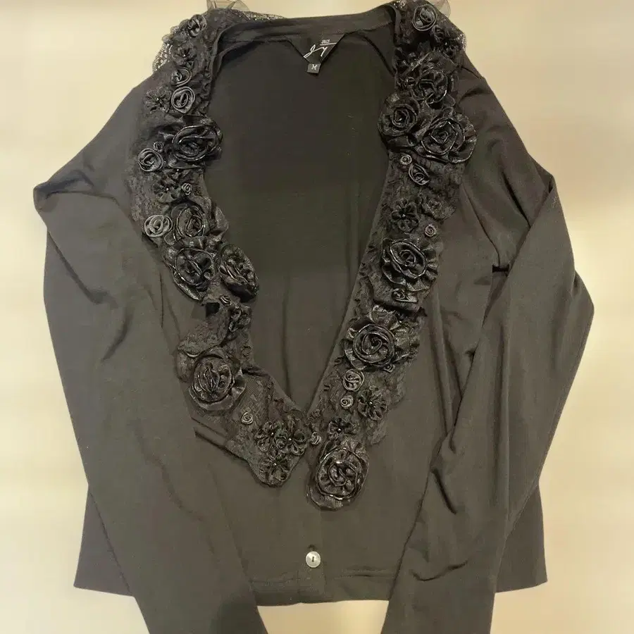 블랙 긴팔 가디건, 꽃무늬 장식이 특징이며, 폴리에스테르 소재로 쾌적한 착용감. - 색상: 블랙 - 소재: 폴리에스테르 95%, 폴리우레탄 5% - 디자인: 꽃무늬 장식 포함 - 사이즈: M 방문해 주셔서 감사합니다.