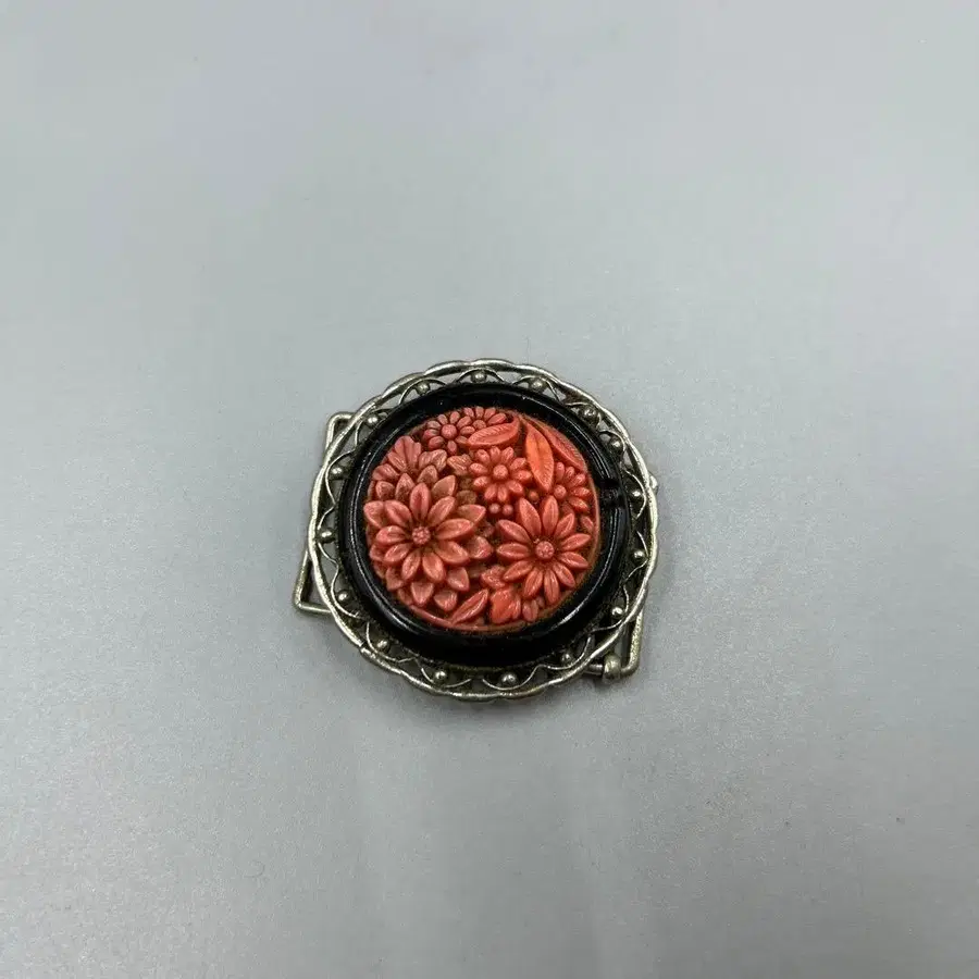 꽃 조각이 새겨진 빨간색 장식의 원형 브로치. - 디자인: 꽃 조각이 새겨진 빨간색 장식 - 소재: 금속제 프레임 - 모양: 원형 - 색상: 빨간색과 블랙의 콤비네이션 방문해 주셔서 감사합니다.