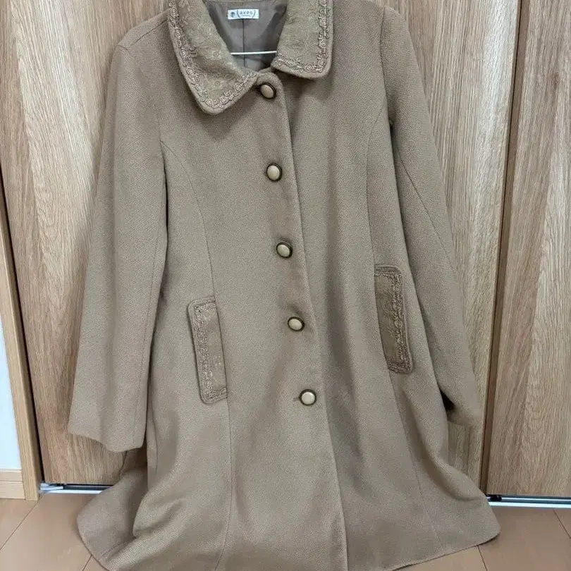 퍼가 달린 베이지색 롱 코트로, 버튼과 포켓이 있어 스타일리시합니다.