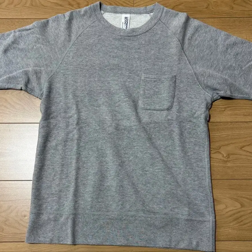 LOOPWHEELER (루프 휠러)의 BEAMS + 별주 제품입니다. 래글런 슬리브, 포켓, 소매에 피스 네임 디자인입니다. 맨투맨 티셔츠용 쭈리 소재, 멜란지 그레이, M 사이즈. 일본제입니다. 저는 170cm 55kg으로 착용했습니다.